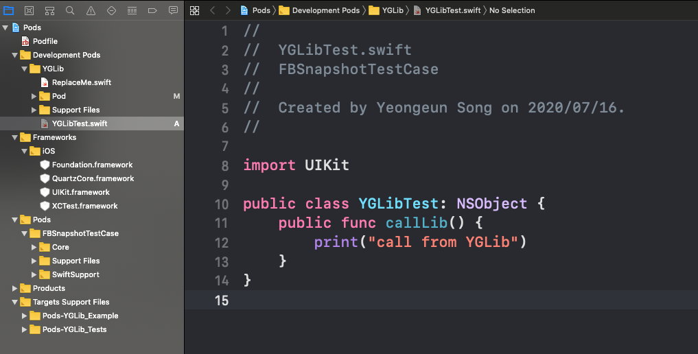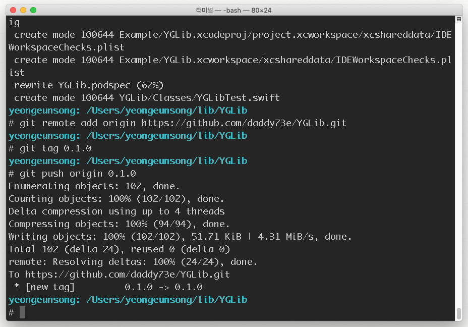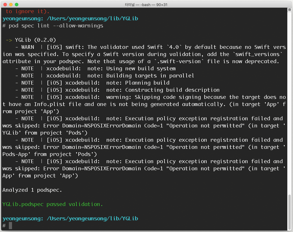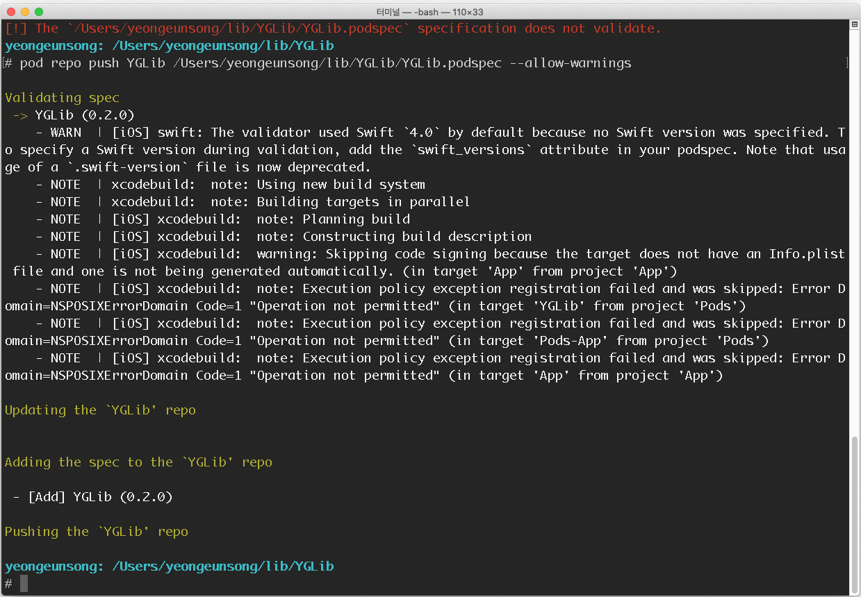 (저의 해당 파일 경로는 /Users/yeongeunsong/lib/YGLib/YGLib.podspec 로 되어있네요)