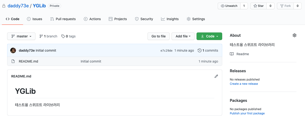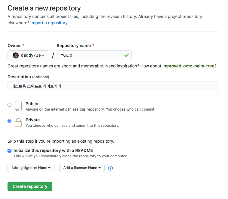 저는 'YGLib'명의 Private프로젝트를 생성했습니다.
