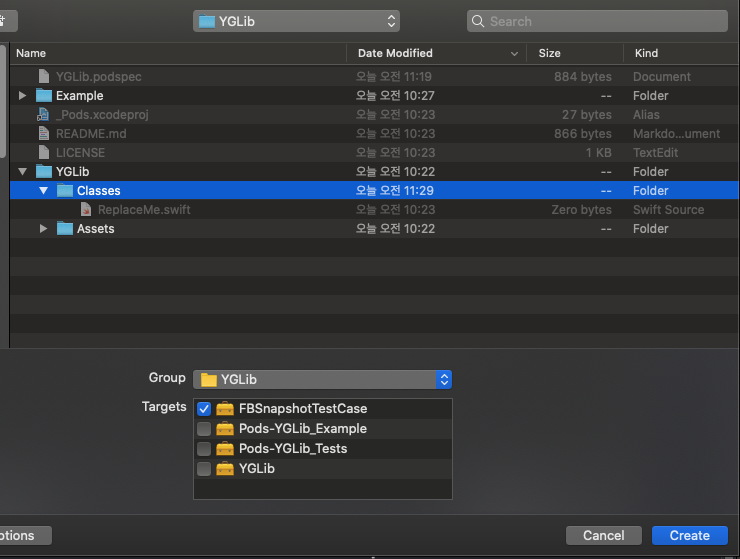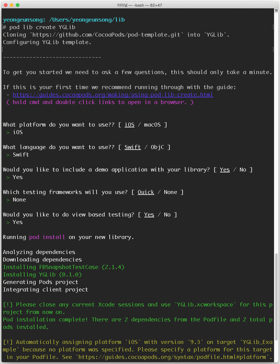 -> 해당 기능을 Yes로 선택하면 FBSnapShotTestCase가 기본적으로 설치됩니다. Facebook의 테스트 프레임워크인데 복잡한 뷰컨트롤러테스트를 쉽게 할 수 있도록 도와준다고합니다. 라이브러리에 View를 포함할 예정이기 때문에 Yes로 해두었습니다.